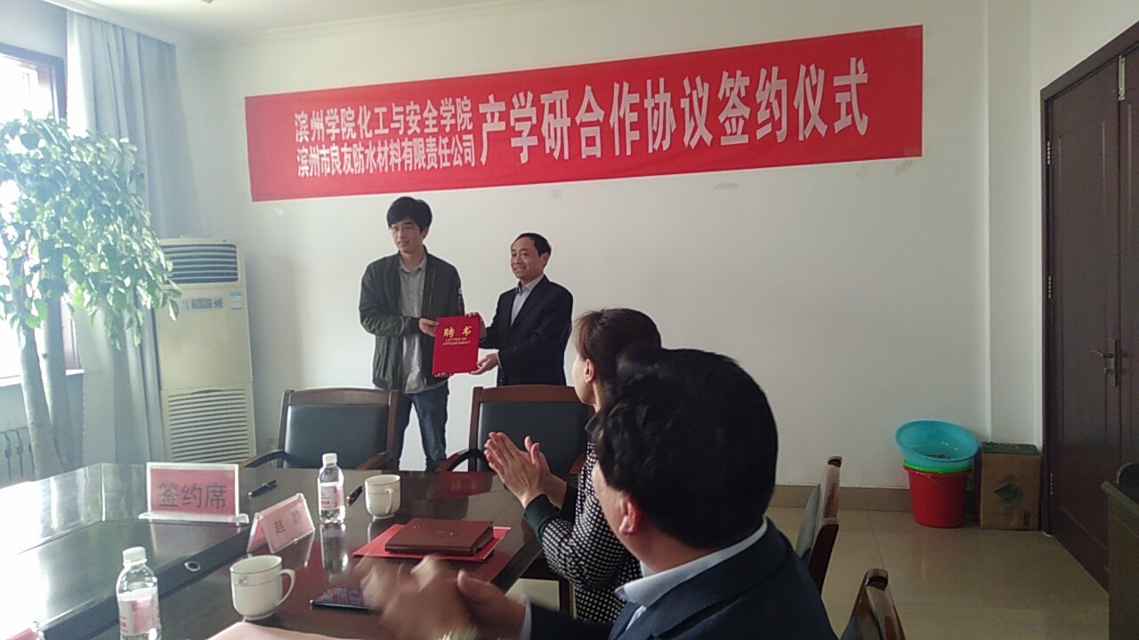 以上领导、专家首先在梁才办事处会议室出席了“滨州学院与良友防水公司的产学研合作签字仪式”,仪式由梁才党工委书记胡成勇主持,胡校长、王部长分别做了致辞,滨州学院化工与安全学院和良友防水公司签订了产学研合作协议,良友防水公司授予了陈宇博士聘书,仪式结束后,全部领导和专家驱车到良友防水公司进行了详细地观摩调研,最后,到良友防水公司的多功能厅进行了座谈,针对良友防水公司的实际情况和滨州学院的人才、技术优势,在产学研合作方面确定了方向、目标,提出了具体的合作领域和课题,不仅强有力地推动良友防水公司的科技创新,也成为滨城区对接滨州学院的开题之举。